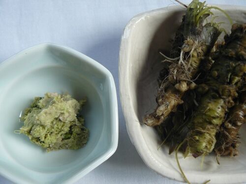 「岐阜に仕事で行ってきた」 と、指位の大きさのワサビを 65才、自称他称「熊さん」 お嫁さん募集中、山仕事の村の男性がくれた。 仕事中に 谷で見つけたんだろうね。 大きな体を曲げて黙々と ワサビを採っている姿が目に浮かぶ。 早速おろして素麺のたれ…