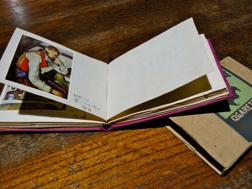 縦が6センチ 横が8・5センチ 厚みが1センチ。 友達が作った豆本のサイズ。 紙は木炭紙で 表紙は濃いピンクの和紙だ。 ケースはボール紙 ゴールデンバットが飛んでいる。 手元にある材料で作った。 名画全集の広告から セザンヌやゴッホや ゴーギャン等を…