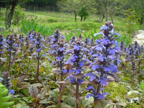 アジュガ 「ああ、驚いた」 春の花は突然花開く様な気がする。 昨日も歩いた道のそばに 淡い紫の花の群生。 暖かい陽の光を浴びて 背筋を伸ばす。 淡い紫の衣をまとい 静かに並んで私を見ている。 お喋りは似合わない。 「名前は?」と尋ねると 小さな声だけ…