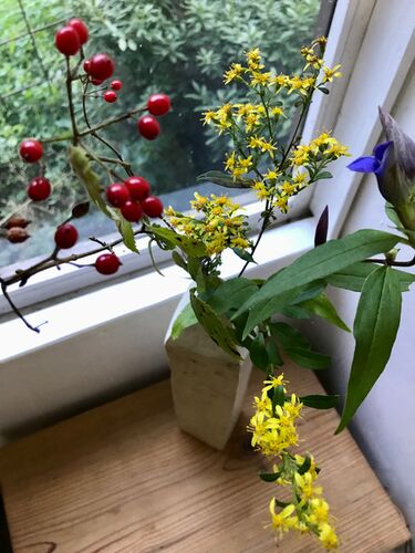ガマズミの実 アキノキリンソウ リンドウ 赤いガマズミの実が群れている 枯れかけた葉の間の 小さな実 鳥達が啄んでいるのを 見た事がない。 アキノキリンソウは 鮮やかな黄色 どこに咲いていても すぐにわかる。 淡い薄紫のリンドウと共に ポキポキと手折り…