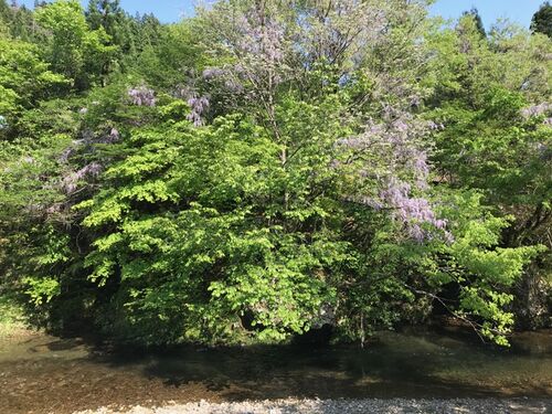 13日 雲一つない 青空。 その空の下の 山々の木々は濃い緑に変わりつつ 風のない午後に 銀杏や紅葉の大木の葉は 時が止まったようにじっとしている。 久しぶりの穏やかな日に 大きく息を吸った。 藤の花が満開だ。 山や川縁 林の中に 薄い紫の藤が 木の枝…
