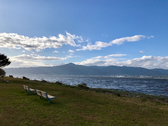 2019-11-16 琵琶湖東岸から(2) 琵琶湖 空 自然 琵琶湖東岸から(比叡山を望む) もう少し 北へ歩こう。 カイツブリが プカリプカリと浮いている水面を 左に見て。 冷たい空気が気持ちいいな。 湖畔に置かれたベンチに座って 向かいの西岸の 山並みを眺めよう。 ここに来れば いつもそう思うが 「暗くなるまでに 早く山に帰らなくては」 と 気が急く。 日の入りが遅くなる頃に ゆっくりと来よう と ベンチに約束。 湖畔に沿って 緩やかに曲がる道を車で走る。 買い物をして 急に黄色く色づき始めた 山に帰って来たのは 暗くなる前の4時半だった。
